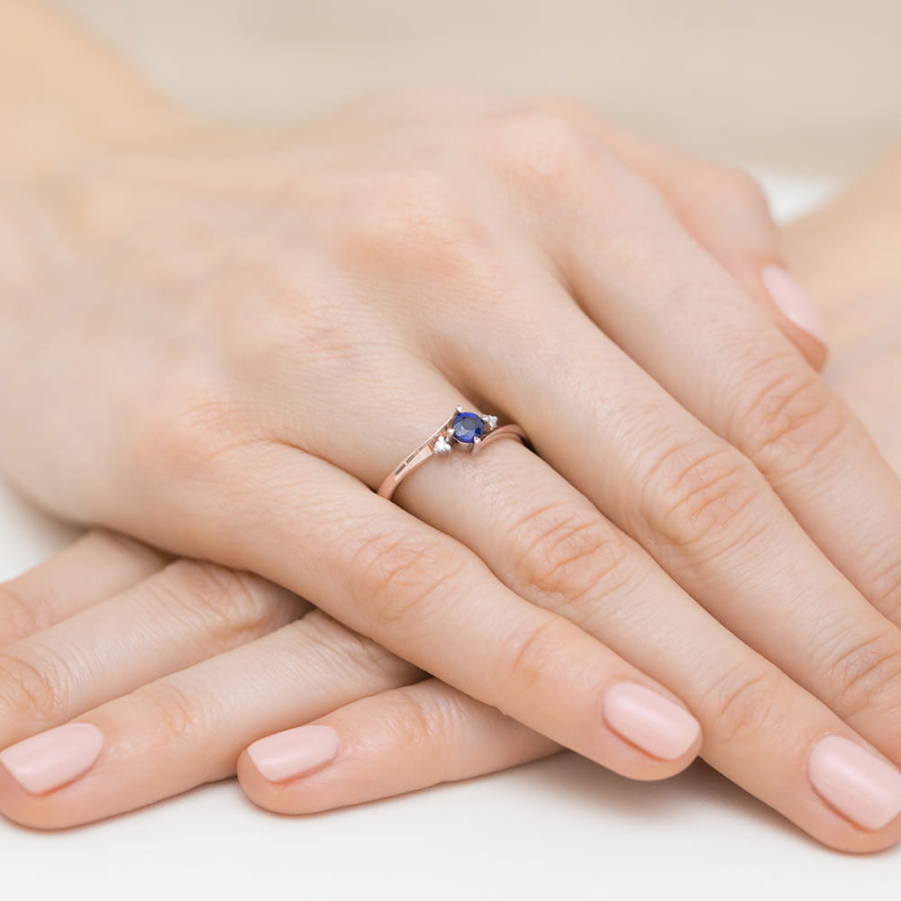 Pierścionek ze złotem i błyszczącym kamieniem na palcu.