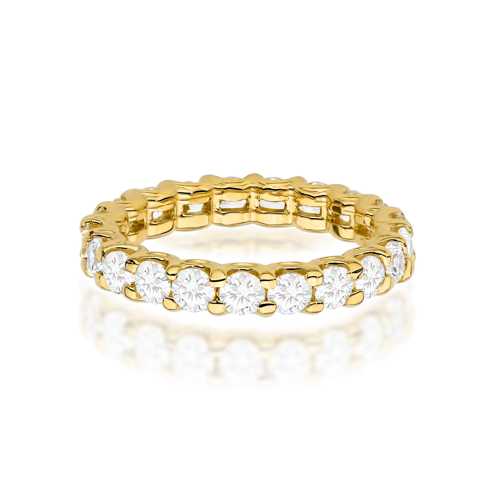 Złoty pierścionek z jednym dużym, okrągłym diamentem osadzonym w sześciu szponach.