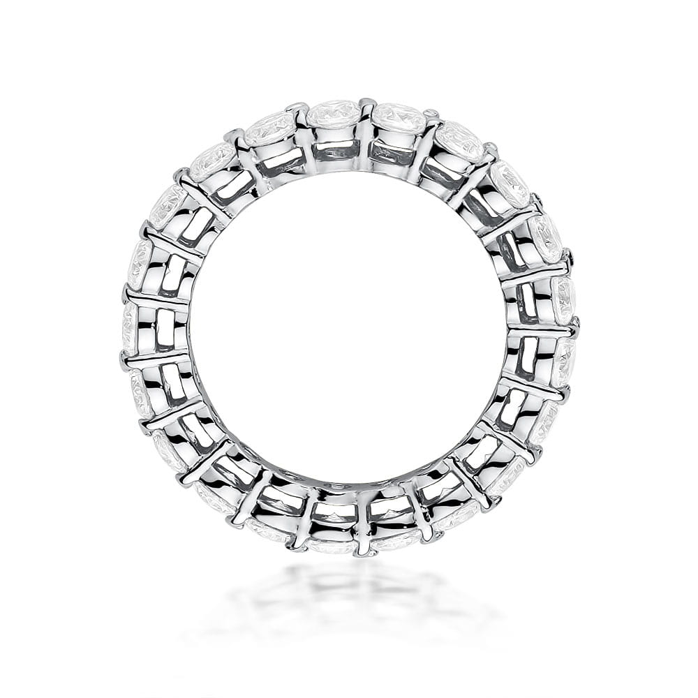 Złoty pierścionek z diamentami, ozdobiony okrągłymi kamieniami wzdłuż całej obrączki.