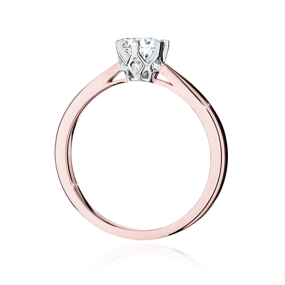 Złoty pierścionek z dużym, okrągłym diamentem osadzonym w eleganckiej koronie.