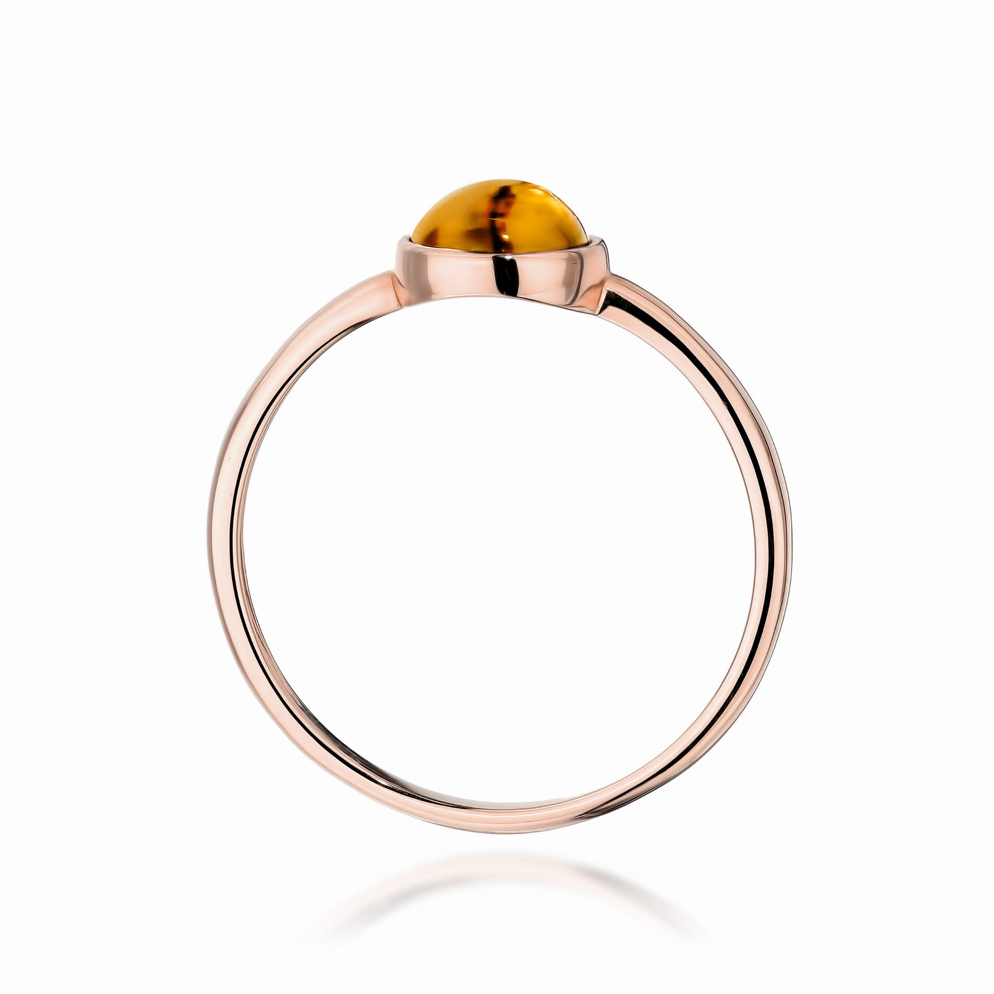 Srebrny pierścionek z żółtym kamieniem centralnym i drobnymi, błyszczącymi zdobieniami.