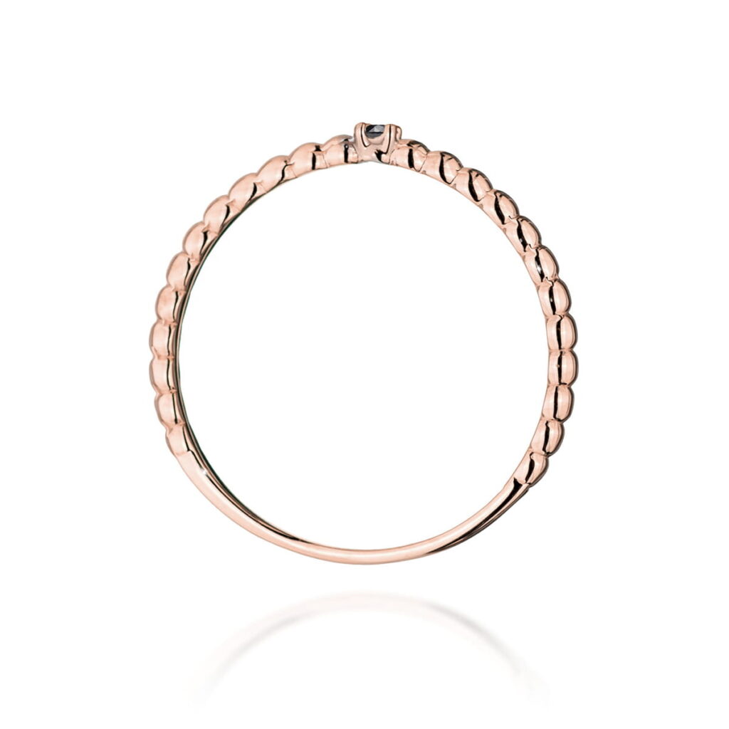 Różowe złote pierścionek z delikatnym, zygzakowatym wzorem i ozdobnymi kamieniami.