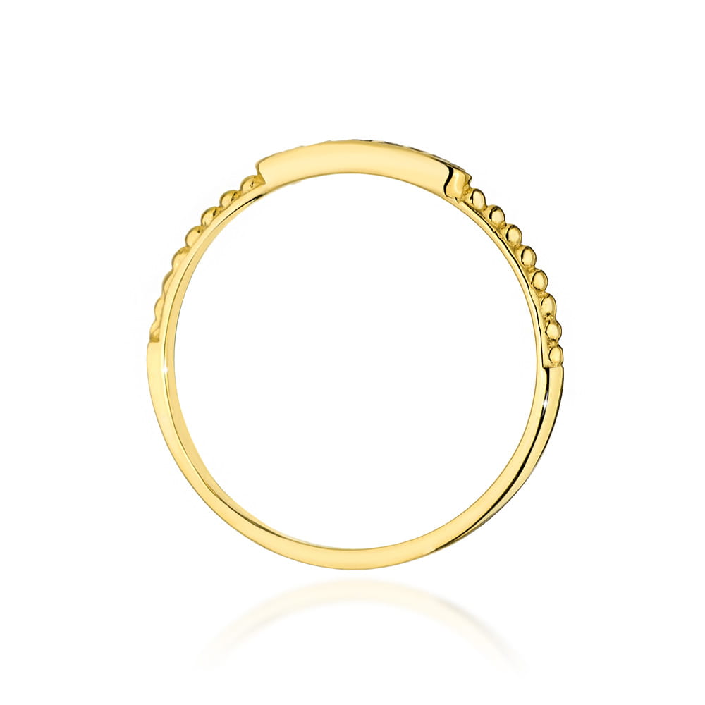 Złoty pierścionek z sercem i małym diamentem, ozdobiony kulkami na obrączce.