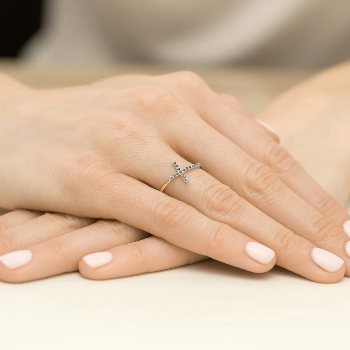 Złoty pierścionek z krzyżem, ozdobiony diamentami na poprzecznej części.